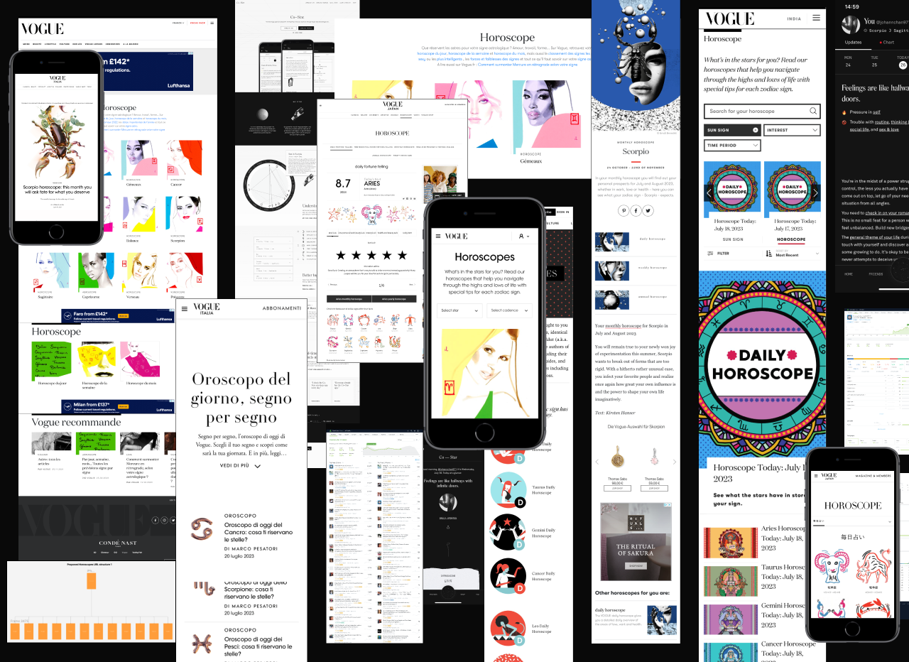The first stage of this project was to compile a detailed audit on the existing Vogue Horoscopes markets. Vogue has 5 markets with Horoscopes sections; Vogue India, Vogue Japan, Vogue Germany, Vogue France and Vogue Italy. Other Condé Nast brands and competitors were also analysed throughout this process.